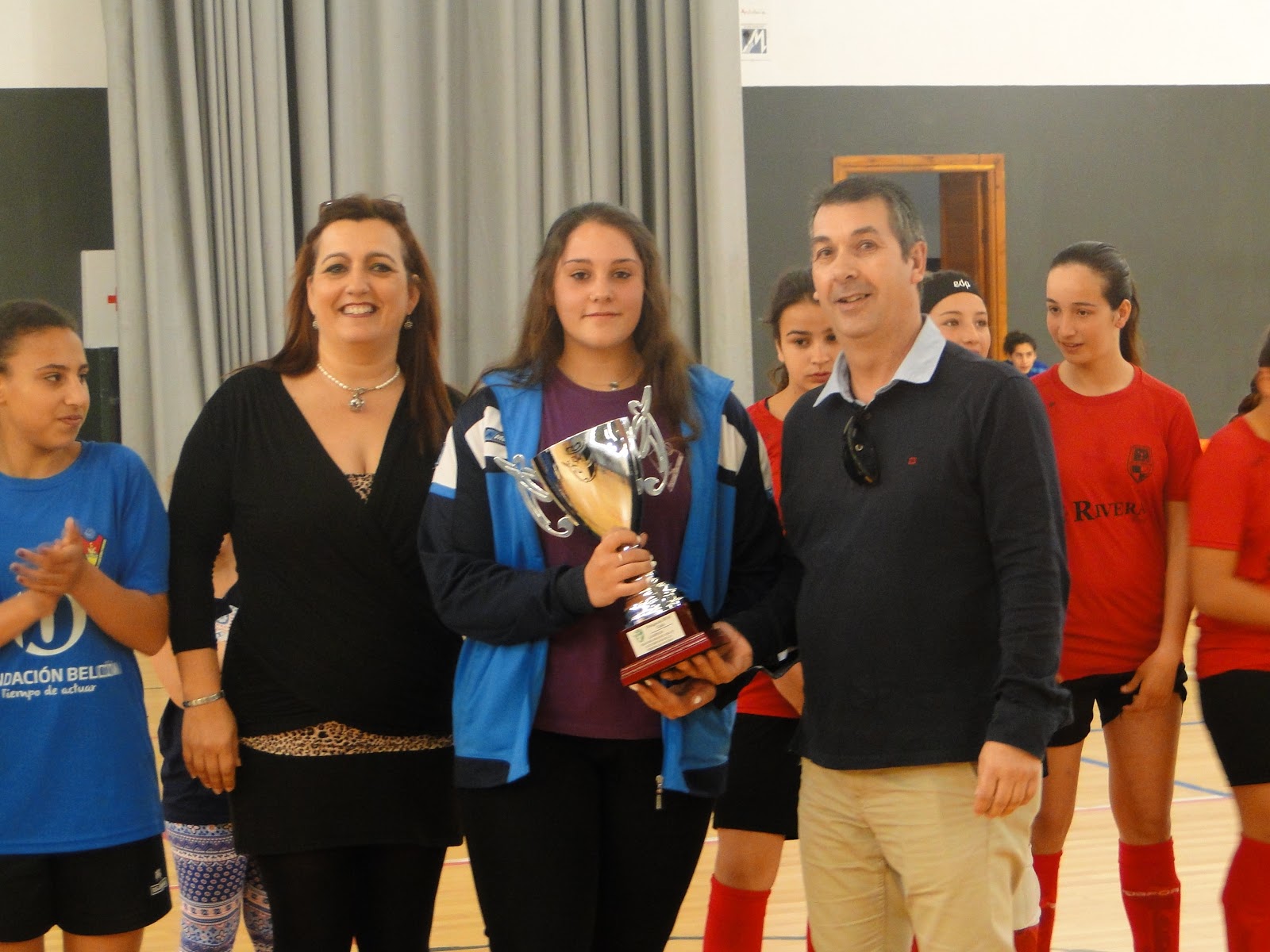 El Presidente de la Federación Gaditana de Fútbol Sala, D. Juan Molins Romero, entregaba la copa de Campeonas Provinciales de la Temporada pasada a las chicas del LUCI.